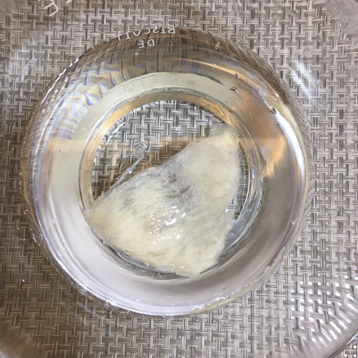 取一盏燕窝,用常温纯净水没过燕窝浸泡,自来水一般都含有杂质和漂白粉,会破坏燕窝的营养、口感。矿泉水属于硬水,会影响燕窝的泡发。