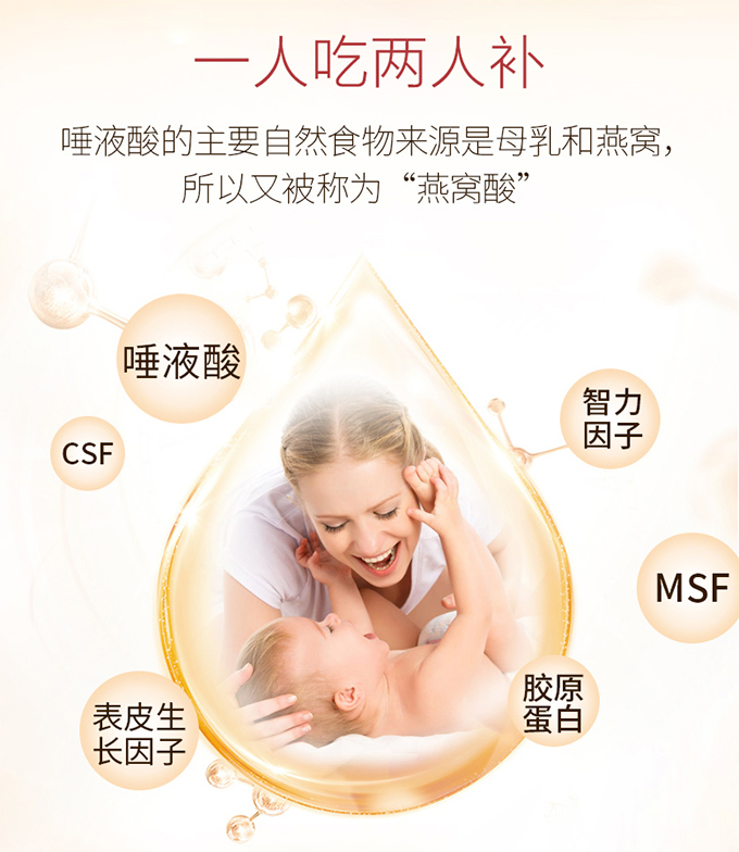 唾液酸还可以提高肠道对维生素及矿物质的吸收、抗病毒、提高人体免疫力。聪明的妈妈在孕期和哺乳期有意识地摄取足够的唾液酸,如燕窝、酪蛋白、牛奶等,能够提高胎儿和幼儿的体质发育。“一人吃、两人补”,“大人吃、小孩补”,因此宝宝在幼儿期也要及时补充唾液酸。