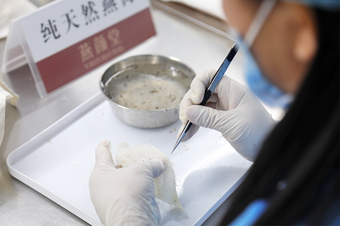 燕窝从燕屋采摘送进工厂,需要进行挑毛才能进入到销售环节。燕窝的挑毛加工比较费时、费力,除了手工挑毛之外没有更好的方法,对工人的眼力和技术要求非常高。初学者可能一天也挑不完一盏,普通工人一天最多也只能挑3~4盏,熟练的工人也只能做到一天挑8~10盏。