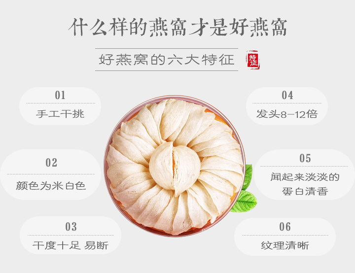 燕颜堂制定了专业的燕窝评级标准,只出售符合标准的6A级、7A级燕窝,不为出量,只为严控品质。同时燕颜堂率先提出“推崇天然燕窝”的口号,只选择极轻毛燕作为原材料,重度污染和无法食用的燕窝在燕屋内便统一处理掉,禁止流向市场。
